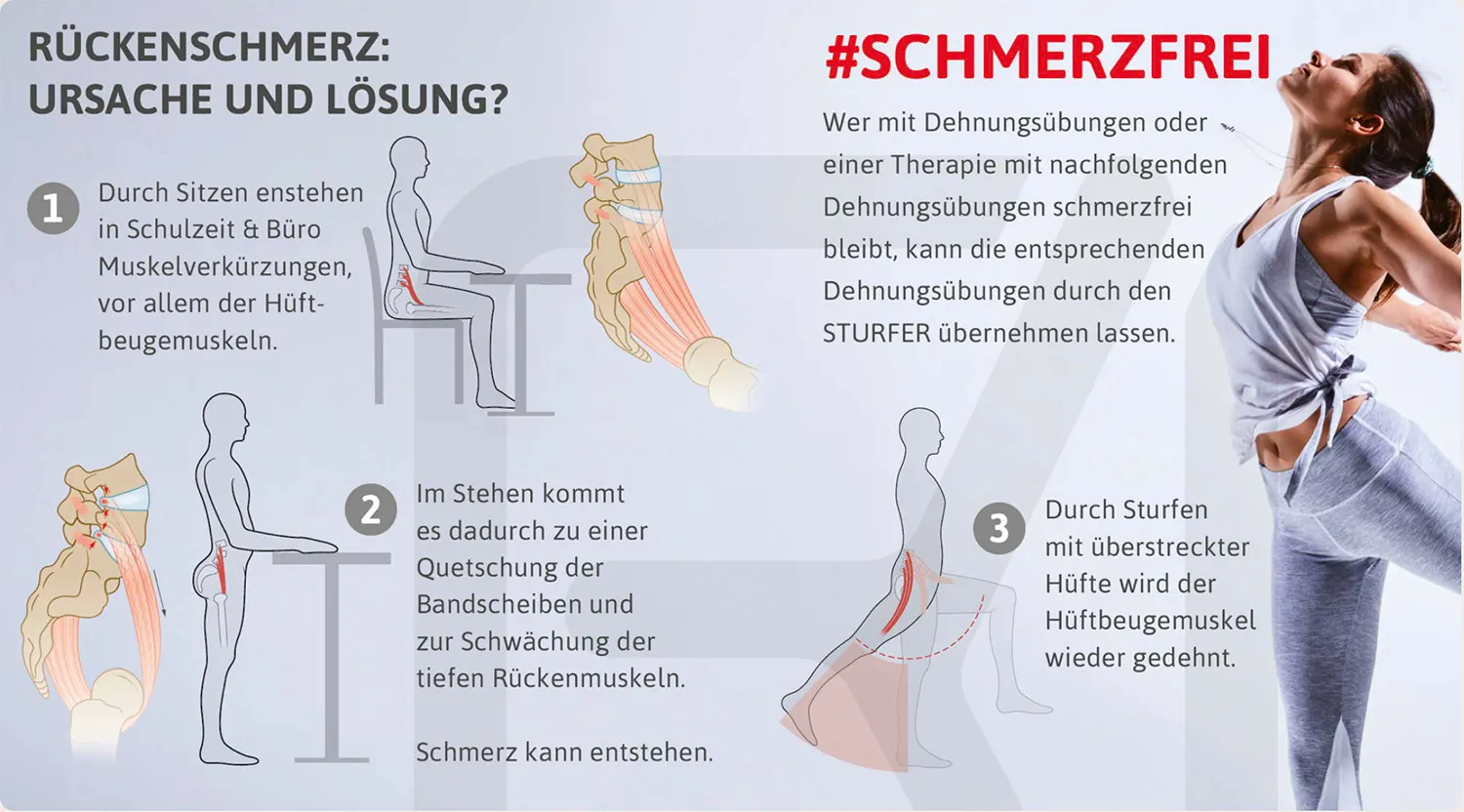 Der Sturfer setzt genau hier an: Durch seine besondere Sitzposition dehnt er die verkürzten Hüftbeuger und aktiviert gleichzeitig die tiefen Stabilisatoren der Wirbelsäule. So wird die natürliche Aufrichtung wiederhergestellt – die Ursache von Rückenschmerzen wird behoben, nicht nur das Symptom.